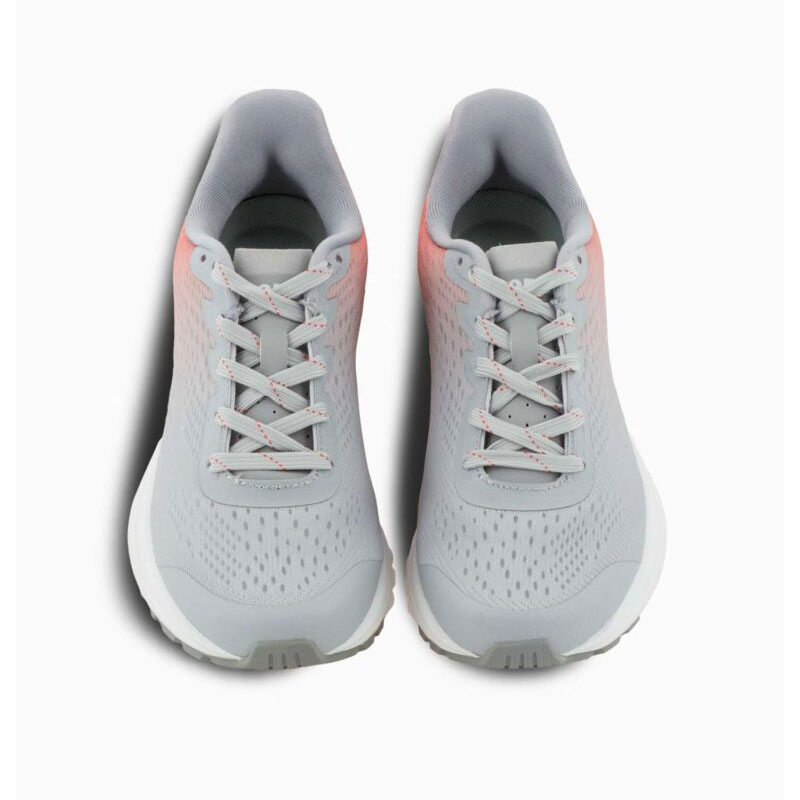 Den mjuka, stickade ovandelen i grått formar sig följsamt efter foten och andas bra under hela dagen. Den korallfärgade detaljen på bakkappan ger en snygg accent och en sportig touch.