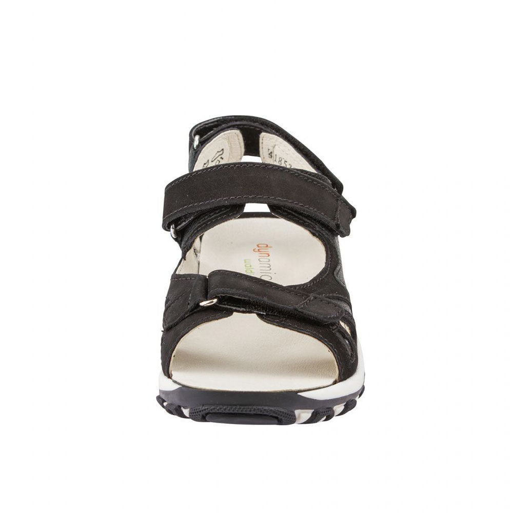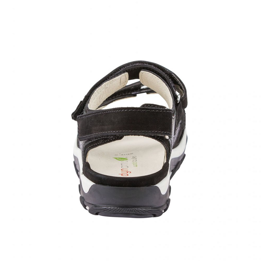Sandalen har tre justerbara kardborreband, inklusive en reglerbar hälrem som gör det enkelt att anpassa passformen. Den är tillverkad i mjukt svart skinn med diskreta vita detaljer, vilket ger ett klassiskt och fräscht intryck.